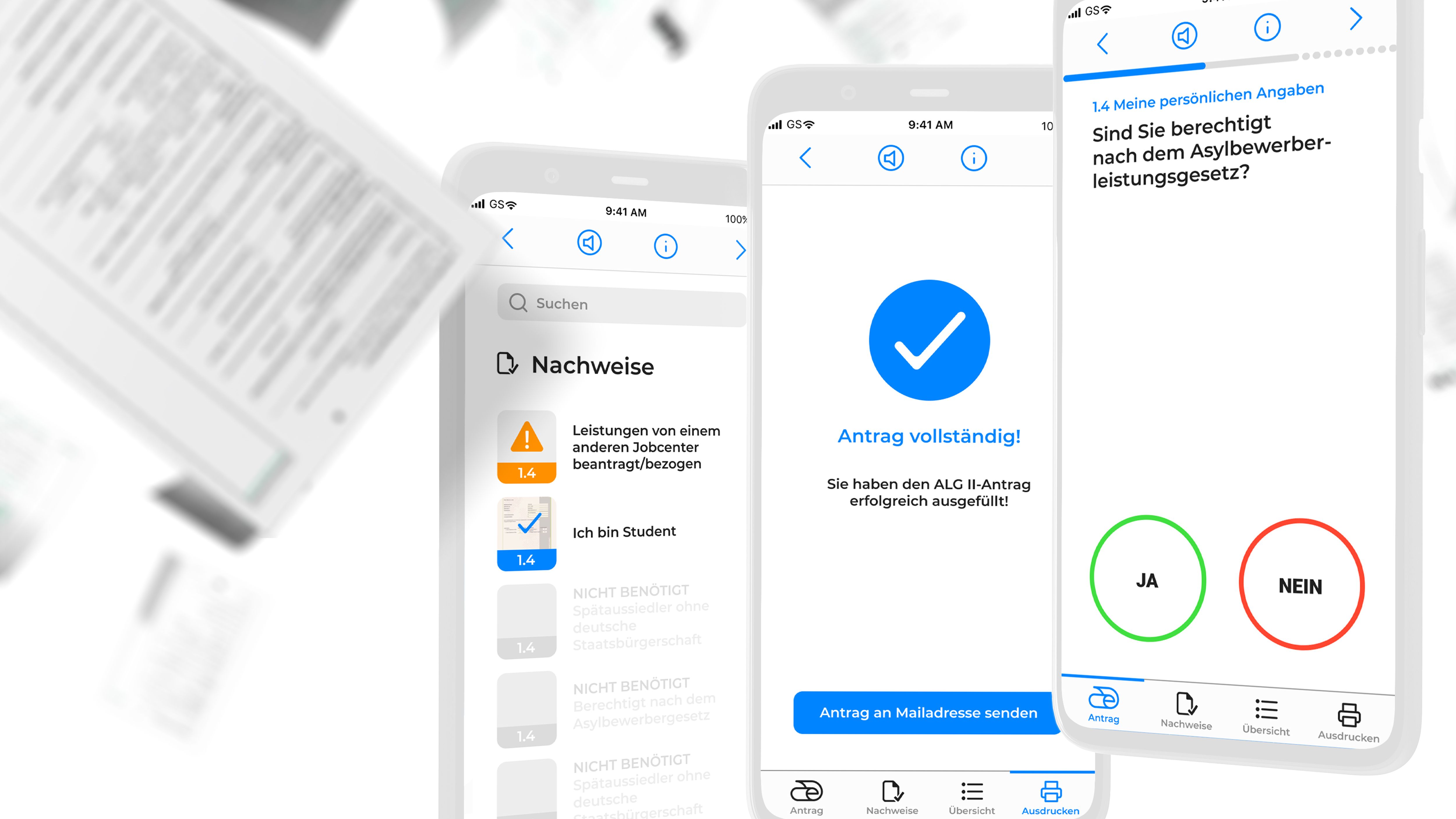 Durch eine Fortschrittsanzeige und den Menüpunkt „Übersicht“ ist jederzeit klar, wie weit man im Ausfüllprozess ist und welche Fragen noch beantwortet werden müssen. Im Menüpunkt „Nachweise“ lassen sich fehlende und bereits hochgeladene Nachweise sowie die Möglichkeit, diese zu fotografieren und zu bearbeiten, finden.